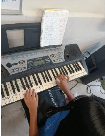 Durante el mes de abril, los usuarios de la academia de música trabajaron contenidos musicales enfocados en la formación de escalas mayores a partir de la escala diatónica de Do (C). Este contenido se desarrolló de manera teórica y práctica, utilizando los instrumentos musicales disponibles en clase: guitarra, teclado, melódica, violín, xilófonos y acordeón.